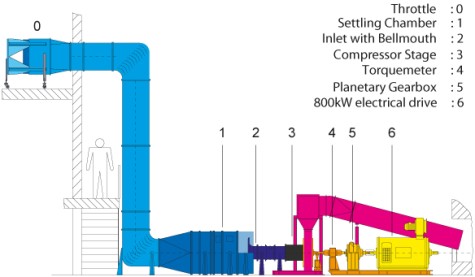 Der einstufige, transsonische Verdichterprüfstand wird im offenen Kreislauf betrieben. Die aus der Umgebung angesaugte Zuluft gelangt zunächst über eine Einlaufdrossel in die mit Sieben und Honigwabengleichrichtern bestückte Beruhigungskammer. Von dort aus wird sie dem Verdichter zur Bestimmung des Massenstromes durch eine kalibrierte Düse zugeführt und dann durch einen Ringdiffusor mit abschließender Ringdrossel als Abluft in die Umgebung gefördert. Der Verdichterrotor wird von einem Gleichstrommotor mit einer Leistung von bis zu 800 kW über ein zweistufiges Planetengetriebe mit nachgeschalteter Drehmomentmesswelle angetrieben.