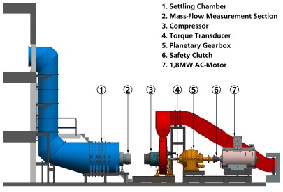 The new test facility for transonic compressor stages TCD2 is based on the know-how gathered by transonic compressor 1. It adopts the basic concept of an open-circle test facility. Air is sucked into the compressor via a settling chamber and a bellmouth. At the compressor outlet the air is guided through a throttle and a collector box and emitted to the ambience. The compressor is driven by a 1,8MW electrical drive. The speed transformation from motor speed to compressor speed is achieved vie a planetary gearbox. Measurement of compressor power and efficiency is performed by a contact-free torque transducer.